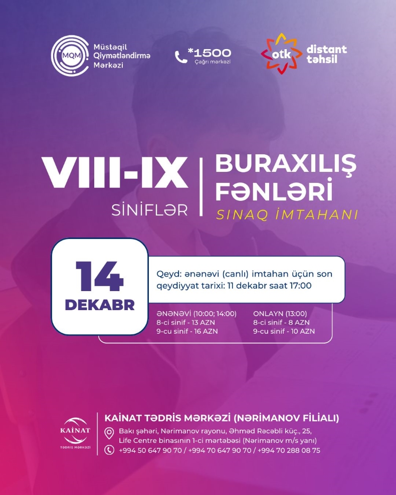 Kainat Tədris Mərkəzinə VIII, IX siniflər üçün BURAXILIŞ FƏNNLƏRİ üzrə hazırlıqlara qeydiyyat davam edir.