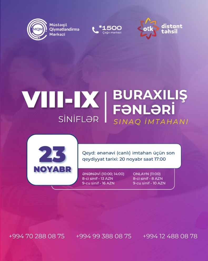 VIII-IX siniflər üçün online və ənənəvi buraxılış fənnləri üzrə sınaq imtahanına qeydiyyat başladı